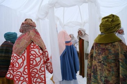 De levensgrote figuren, die de klassieke kerstpersonages zoals Jozef en Maria voorstellen, staan in een soort doorzichtige serre. Een verwijzing naar de Koninklijke Serres van Laken.